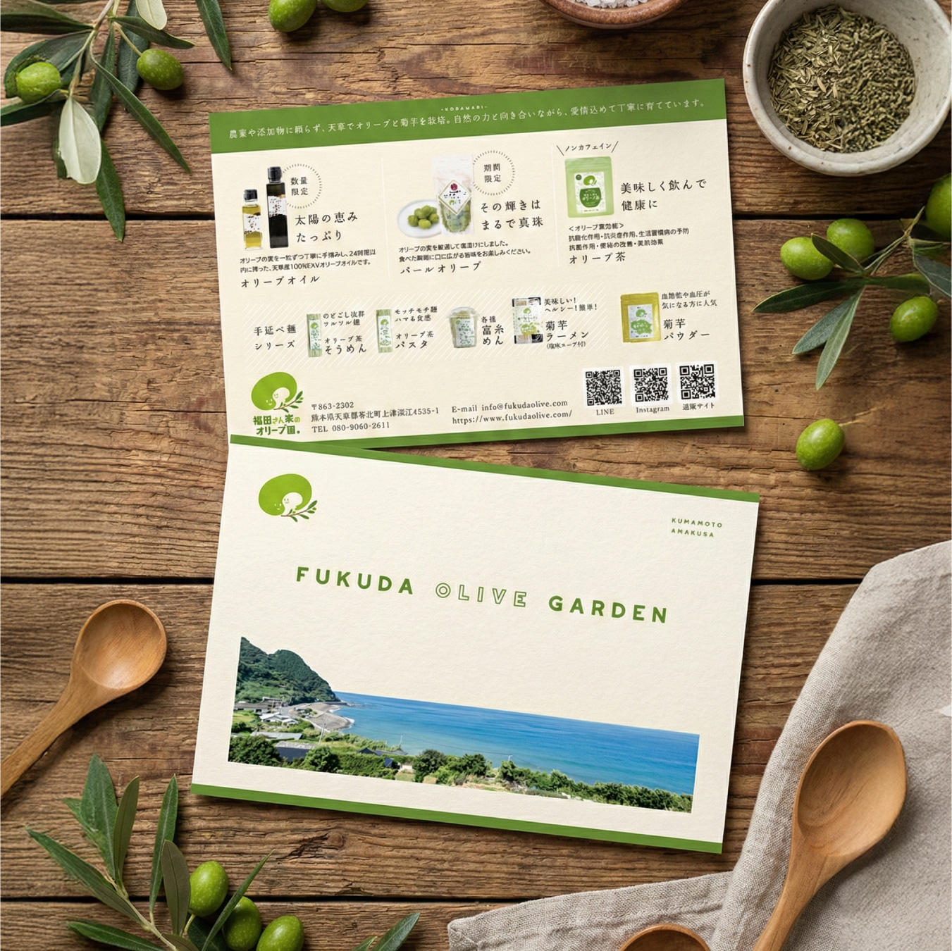 熊本県益城町でさつまいもを栽培、加工、販売をしている「福田さん家のオリーブ園。」様のパンフレットをデザインしました。